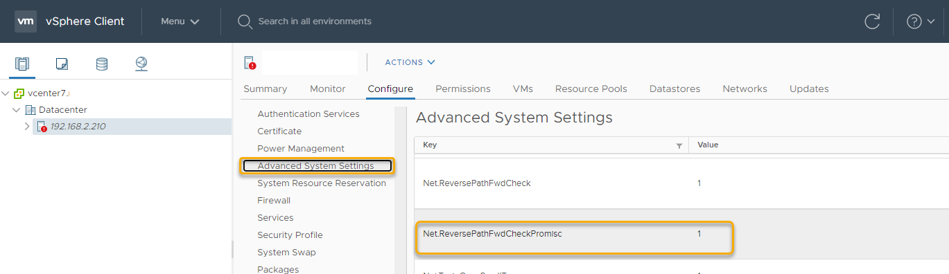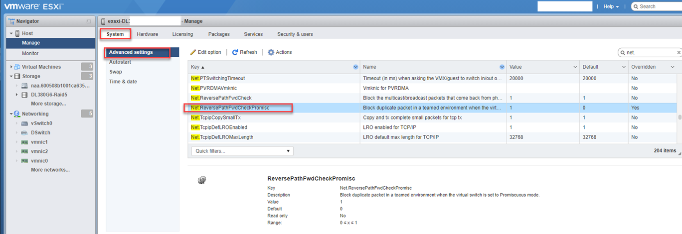 Die Net.ReversePathFwdCheckPromisc Option ist standardmäßig nicht aktiviert und wird auf dem hier beschriebenen Weg global aktiviert.