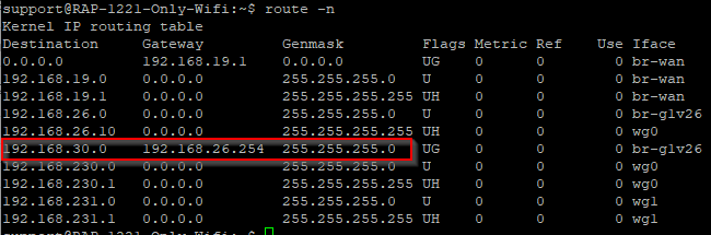 Sobald man sich per SSH auf den AP eingeloggt hat, kann mit dem Befehl „route -n“ kontrolliert werden, ob die Route(n) richtig auf dem AP hinterlegt sind.