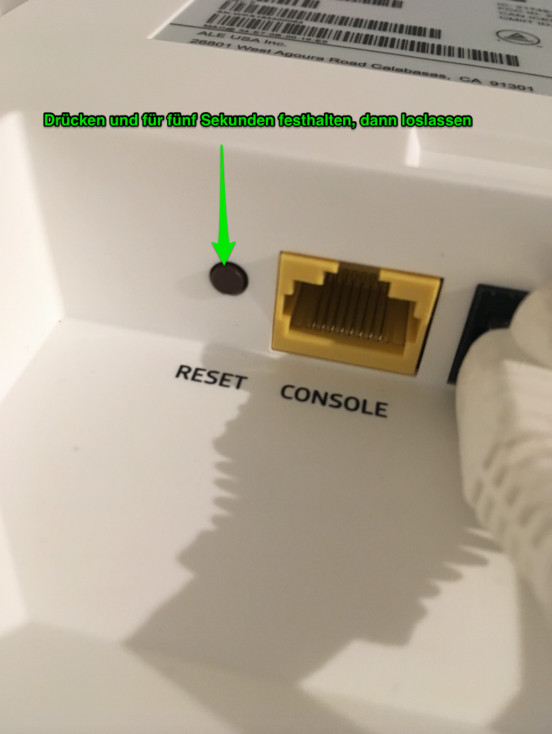 Für den Fall dass man das Gerät auf Werkseinstellungen zurücksetzen möchte (Factory Reset), drückt man den „Reset“ Knopf auf der Rückseite für fünf Sekunden und lässt diesen dann los. Der AP1101 löscht daraufhin die Konfiguration und startet neu.