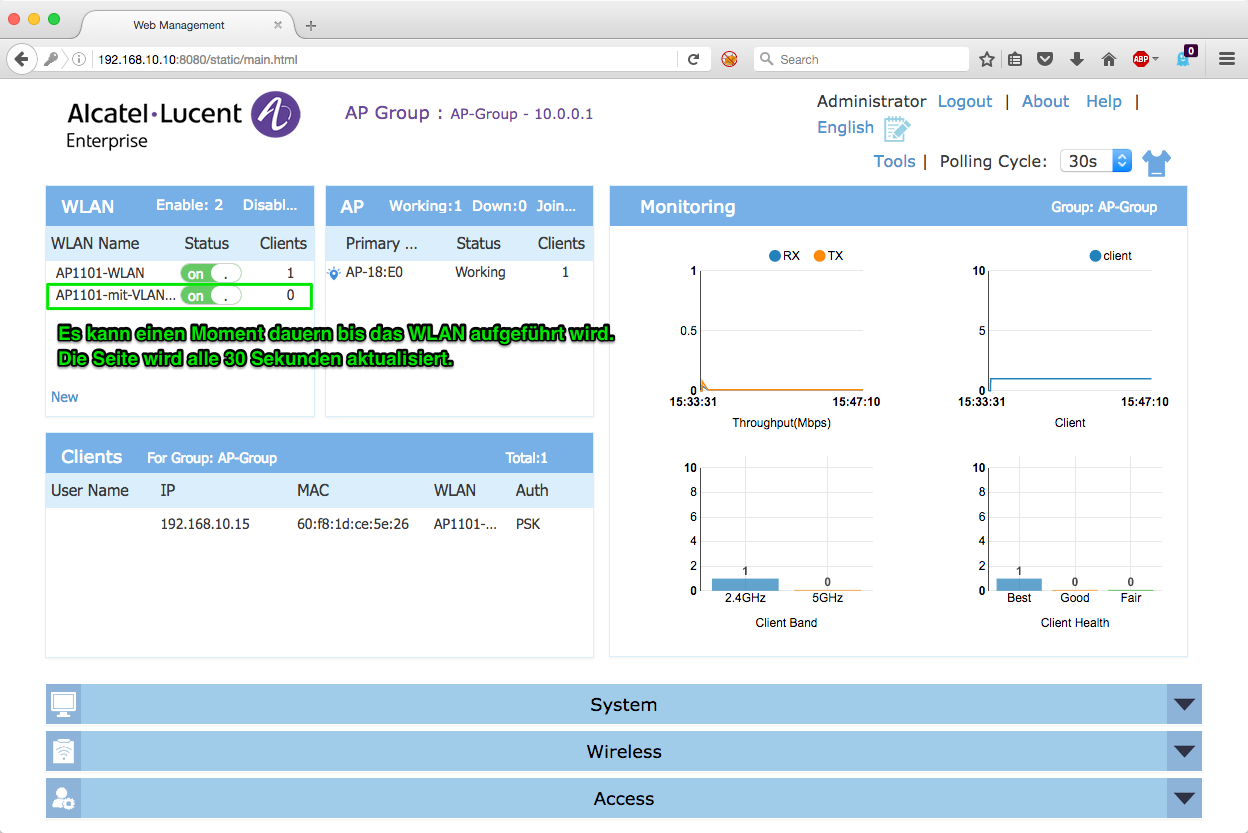 Ich möchte an dieser Stelle die Verwendung von AOS-WNG mit Version >= 2.1.0.100 empfehlen. In diesem Release steht die deutsche Menüführung im WebGUI und HTTPS (verschlüsselte Administration) zur Verfügung.