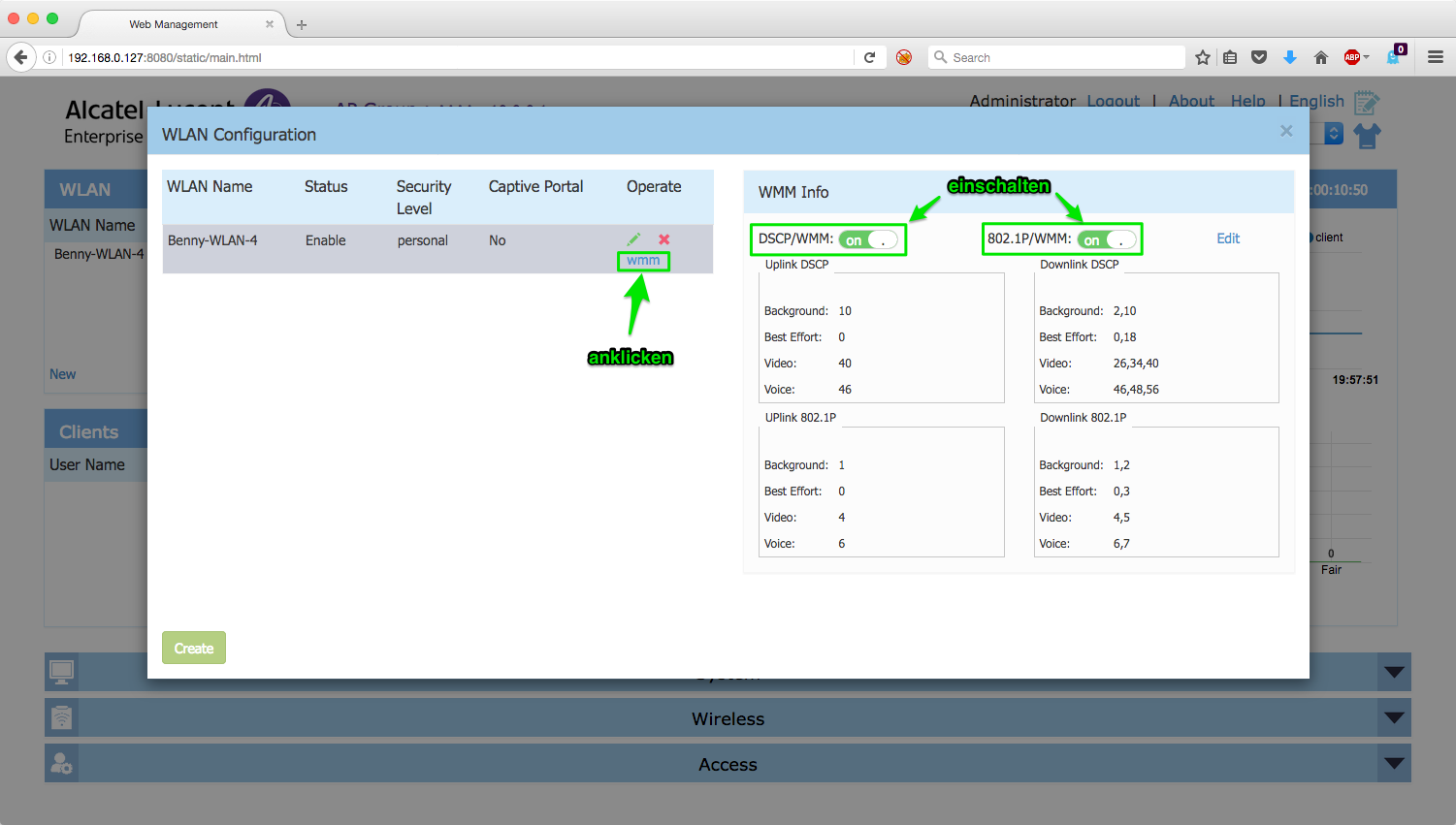 Wenn ein WLAN mit VLAN-Tag (802.1q) versehen wird, muss seitens des Switches auch ein VLAN-Tag eingerichtet werden.