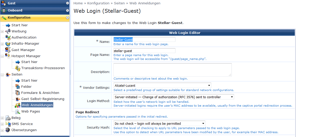Des Weiteren muss eine Gäste-Seite (Web Login) erstellt sein, die die Anmeldung durchführt.