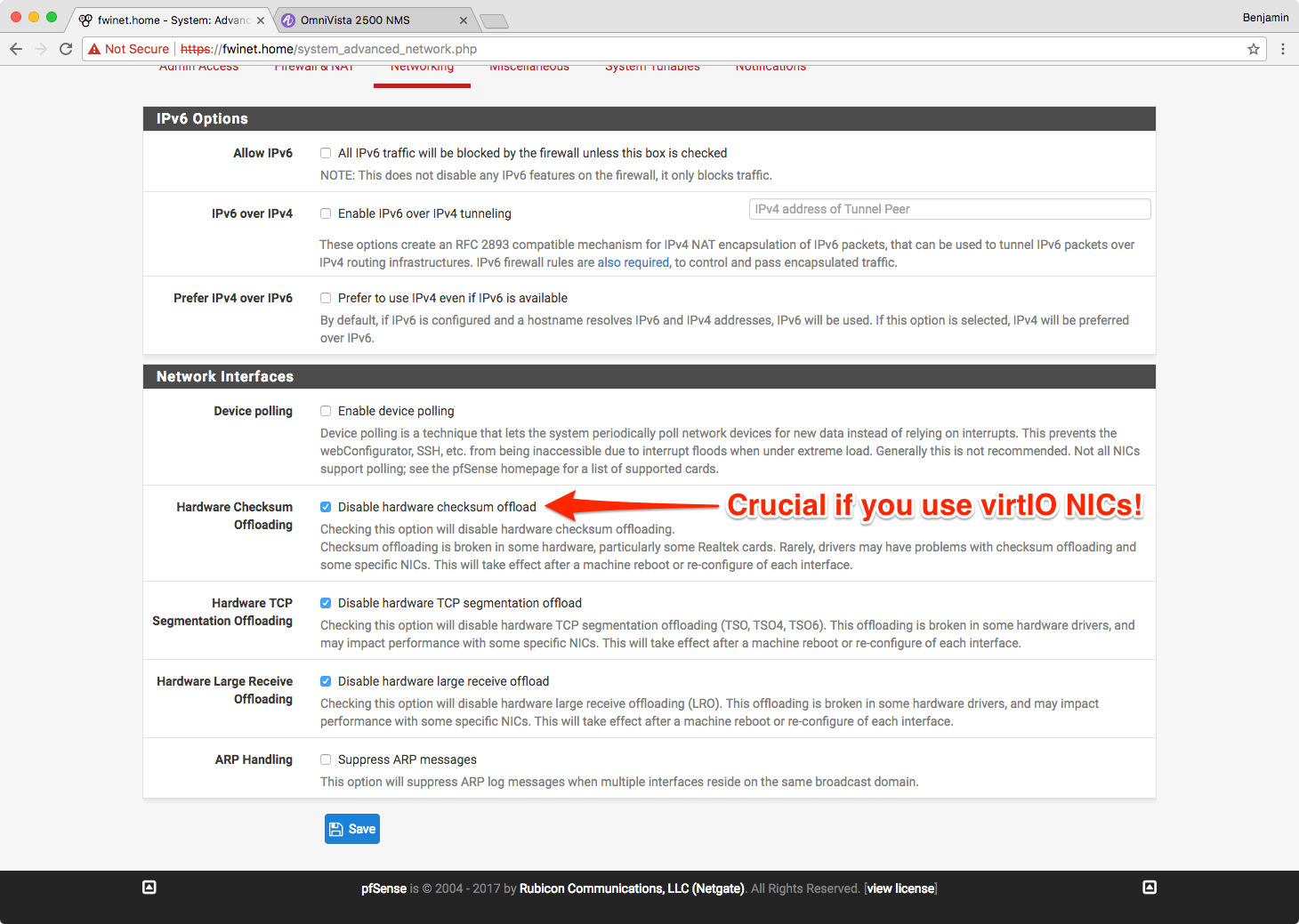 $ cat /etc/network/interfaces # This file describes the network interfaces available on your system # and how to activate them. For more information, see interfaces(5). source /etc/network/interfaces.d/* # The loopback network interface auto lo iface lo inet loopback # The primary network interface #allow-hotplug eth0 #iface eth0 inet dhcp # Interface towards ISP auto brWAN iface brWAN inet manual bridge_ports eno5 bridge_fd 5 bridge_hello 2 bridge_maxage 12 bridge_maxwait 0 bridge_stp off # Interface towards internal network - eno1 # VLAN dot1q 2, 10, 11, 12, 13, 14, 15 auto eno1.2 eno1.10 eno1.11 eno1.12 eno1.13 eno1.14 eno1.15 # Ensure that there is no IP address on the interfaces #iface eno1.1 inet manual iface eno1.2 inet manual iface eno1.10 inet manual iface eno1.11 inet manual iface eno1.12 inet manual iface eno1.13 inet manual iface eno1.14 inet manual iface eno1.15 inet manual auto brvlan2 iface brvlan2 inet static address 192.168.2.1 network 192.168.2.0 netmask 255.255.255.0 gateway 192.168.2.254 bridge_ports eno1.2 bridge_fd 5 bridge_hello 2 bridge_maxage 12 bridge_maxwait 0 bridge_stp off # Routing towards clients through OS6450 up /sbin/route add -net 192.168.10.0 netmask 255.255.255.0 gw 192.168.2.10 up /sbin/route add -net 192.168.11.0 netmask 255.255.255.0 gw 192.168.2.10 up /sbin/route add -net 192.168.12.0 netmask 255.255.255.0 gw 192.168.2.10 up /sbin/route add -net 192.168.13.0 netmask 255.255.255.0 gw 192.168.2.10 up /sbin/route add -net 192.168.14.0 netmask 255.255.255.0 gw 192.168.2.10 up /sbin/route add -net 192.168.15.0 netmask 255.255.255.0 gw 192.168.2.10 down /sbin/route delete -net 192.168.10.0 netmask 255.255.255.0 gw 192.168.2.10 down /sbin/route delete -net 192.168.11.0 netmask 255.255.255.0 gw 192.168.2.10 down /sbin/route delete -net 192.168.12.0 netmask 255.255.255.0 gw 192.168.2.10 down /sbin/route delete -net 192.168.13.0 netmask 255.255.255.0 gw 192.168.2.10 down /sbin/route delete -net 192.168.14.0 netmask 255.255.255.0 gw 192.168.2.10 down /sbin/route delete -net 192.168.15.0 netmask 255.255.255.0 gw 192.168.2.10 auto brvlan10 iface brvlan10 inet manual bridge_ports eno1.10 bridge_fd 5 bridge_hello 2 bridge_maxage 12 bridge_maxwait 0 bridge_stp off auto brvlan11 iface brvlan11 inet manual bridge_ports eno1.11 bridge_fd 5 bridge_hello 2 bridge_maxage 12 bridge_maxwait 0 bridge_stp off auto brvlan12 iface brvlan12 inet manual bridge_ports eno1.12 bridge_fd 5 bridge_hello 2 bridge_maxage 12 bridge_maxwait 0 bridge_stp off auto brvlan13 iface brvlan13 inet manual bridge_ports eno1.13 bridge_fd 5 bridge_hello 2 bridge_maxage 12 bridge_maxwait 0 bridge_stp off auto brvlan14 iface brvlan14 inet manual bridge_ports eno1.14 bridge_fd 5 bridge_hello 2 bridge_maxage 12 bridge_maxwait 0 bridge_stp off auto brvlan15 iface brvlan15 inet manual bridge_ports eno1.15 bridge_fd 5 bridge_hello 2 bridge_maxage 12 bridge_maxwait 0 bridge_stp off