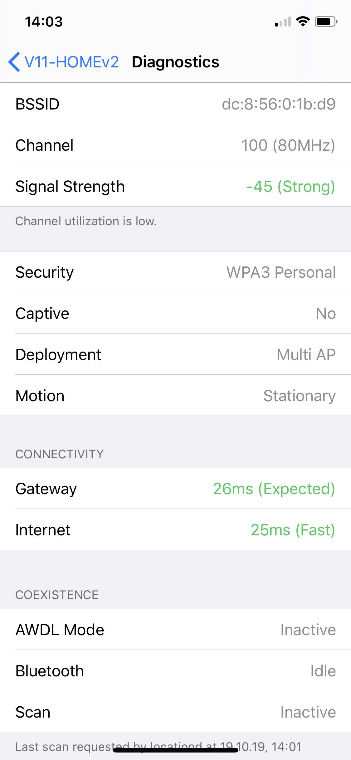Regardless if you're using iOS 13 or iPadOS, you'll be able to gather more or less helpful data on your wireless network. The most simple way is obviously to review the output in Settings → Wi-Fi, but this doesn't really go much beyond the IP address of your device. This article will highlight various ways to collect extensive data on your (and surrounding) wireless networks and how the iPhone rates the connection to my Alcatel-Lucent Enterprise Stellar Wireless Access Points. This article contains knowledge acquired by reading this valuable blog article.