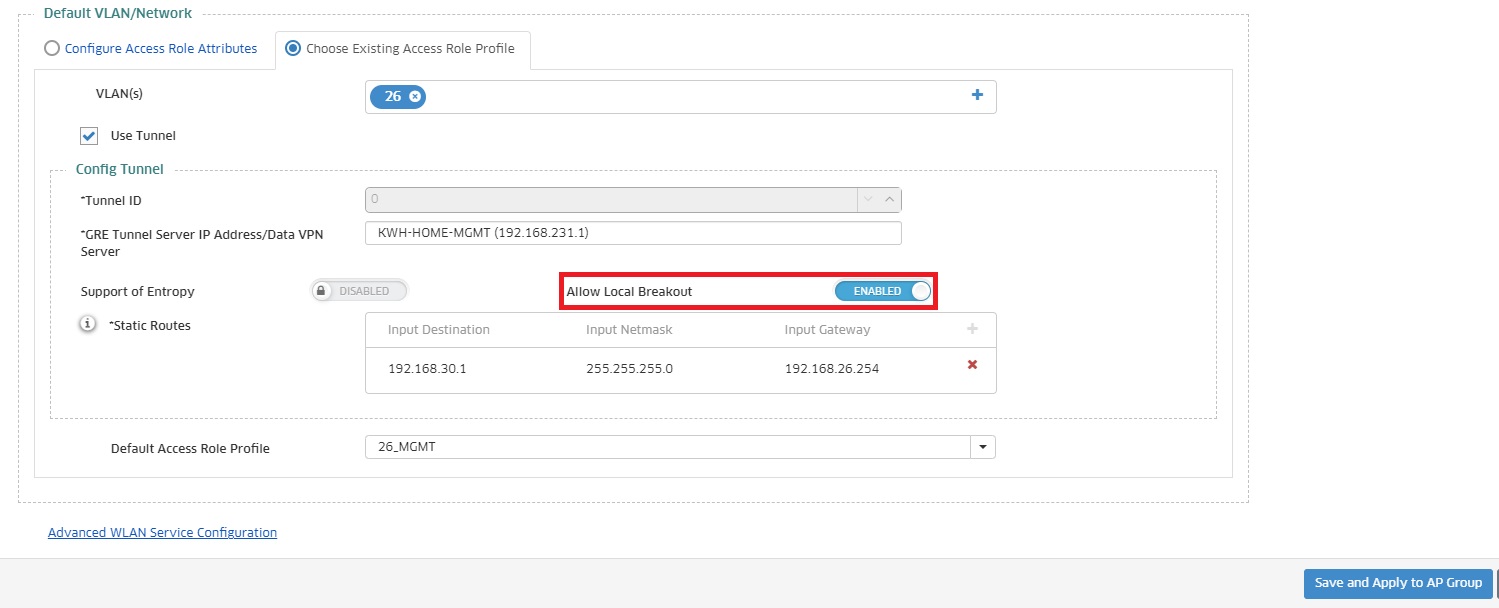 Das „Access Role Profile“, welches im „Access Auth Profile“ eingetragen wird, muss ebenfalls konfiguriert werden. Dort ist zu beachten, dass man bei „Apply to Device“ die Mapping Method auf „Map to VLAN and Tunnel“ umgestellt werden muss. Im Bereich VLAN trägt man das gewünschte VLAN ein und beim Tunnel Profile trägt man das gewünschte Tunnel Profil ein. Zu guter Letzt muss noch die entsprechende AP Group ausgewählt werden.