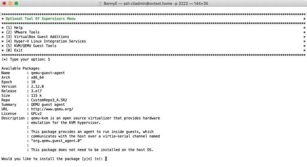 In diesem Menü muss dann nur noch Option 5: "KVM/QEMU Guest Tools" ausgewählt werden