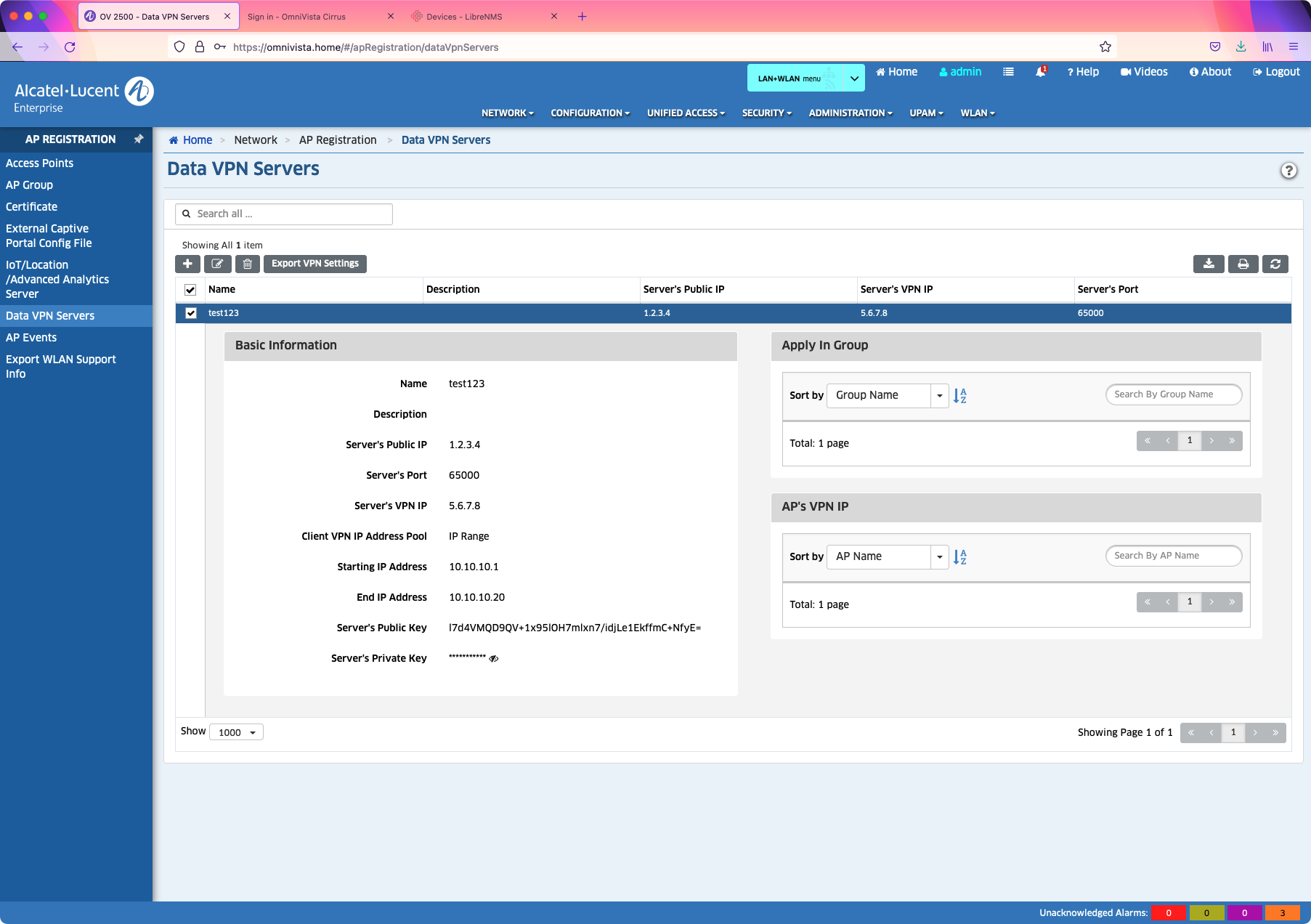 Der „Private Key“ wird in den Übersichtsseiten von z.B. „AP Registration → Data VPN“ oder der Liste der Access Points nun mit einem Augensymbol versteckt. Damit wird verhindert dass in einer Screensharing-Session (Webinar o.ä.) sensitives Schlüsselmaterial unabsichtlich veröffentlicht wird.