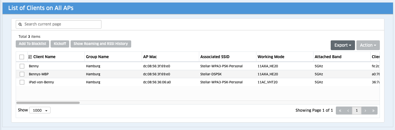 Es ist nun für die Administratoren möglich ein Wireless Client administrativ vom Netz zu trennen. Dafür wird der entsprechende Client aus der Liste ausgewählt und dann per „Kickoff“ der Stellar Wireless AP aufgefordert den Client zu trennen. Die Aktion wird vom AP direkt durchgeführt, es kann aber einen Moment dauern bis dies aus der Client-Liste ersichtlich ist (dies hängt mit dem Update-Interval zusammen). Oft wird sich der Client von sich aus wieder verbinden, die vorherige Trennung ist dann aus der „Associate Time“ ersichtlich.