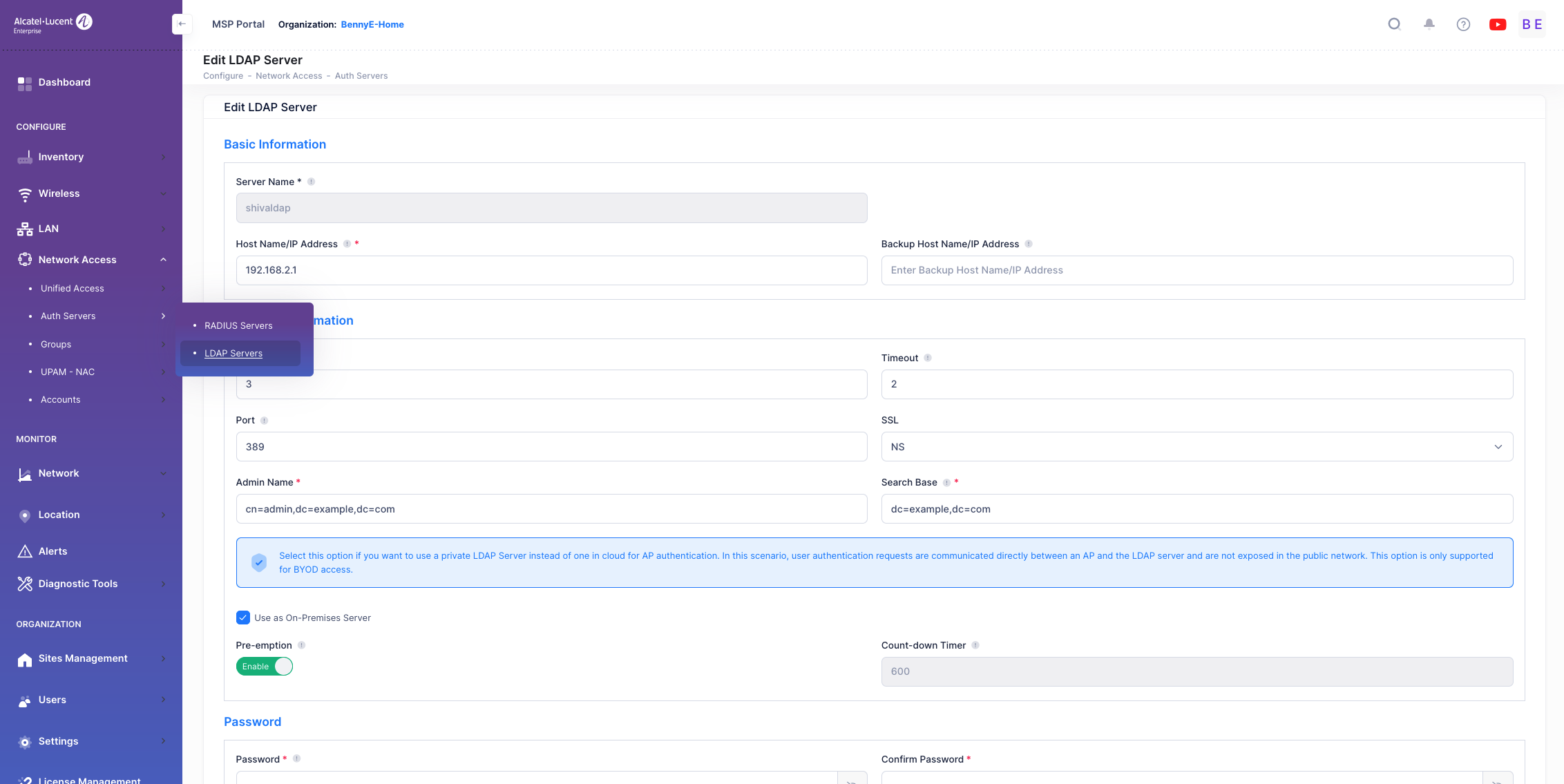In diesem Beispiel soll die Authentifizierung der Nutzer (nach Kenntnis des PSK für BYOD-SSID) über einen lokalen LDAP-Server mit Anmeldung an Captive Portal erfolgen.