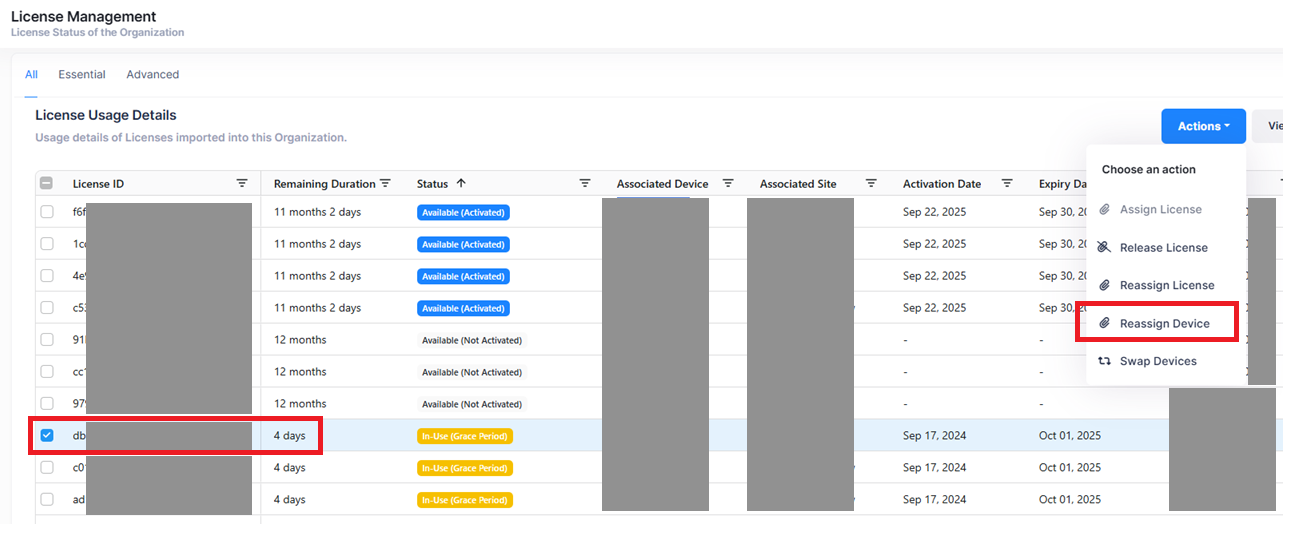 Gerät / Lizenz markieren die geändert werden soll und „Reassign Device“ unter Actions wählen.