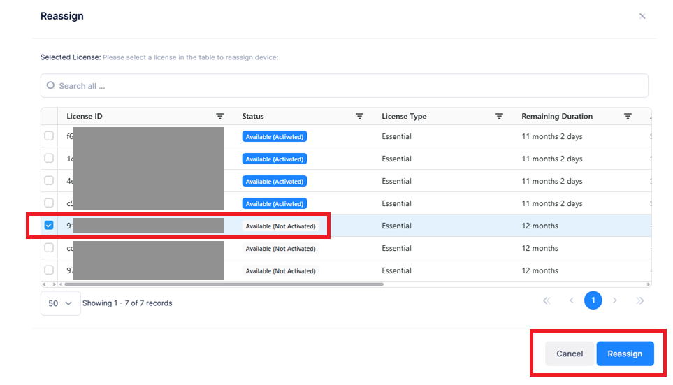 Eine verfügbare/freie Lizenz mit gewünschter restlicher Laufzeit wählen und mit „Reassign“ bestätigen.