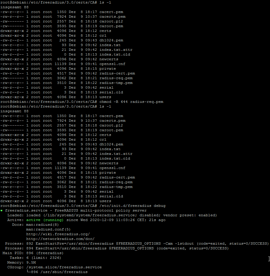 In meinem Fall konnte der freeradius nicht gestartet werden, da Berechtigungen für das Zertifikat „radius-req.pem“ gefehlt haben. Mit dem Befehl „chmod -R 644 etc/freeradius/3.0/certs/CA/radius-req.pem“ habe ich die Berechtigung angepasst. Anschließend konnte ich den freeradius starten.