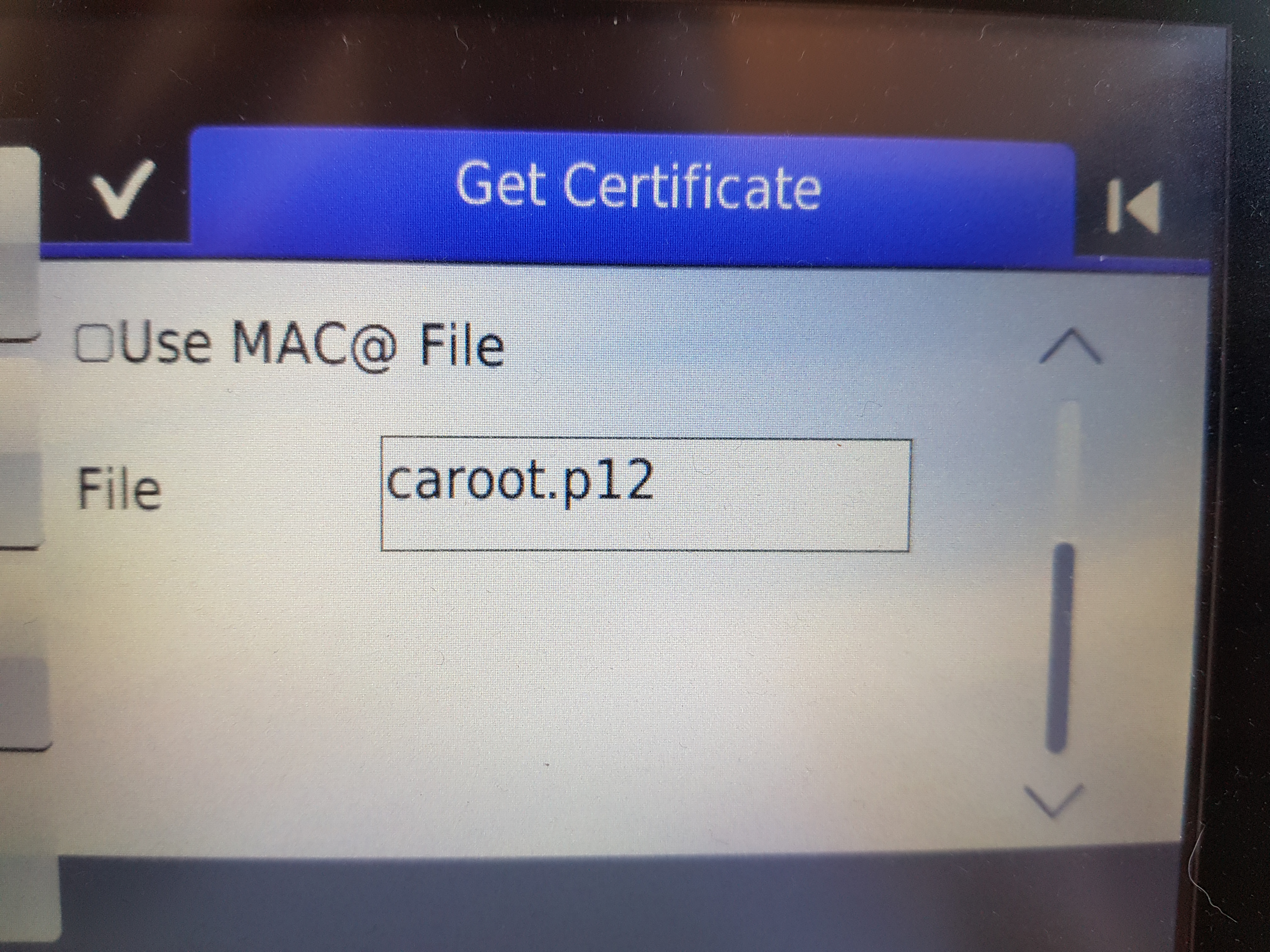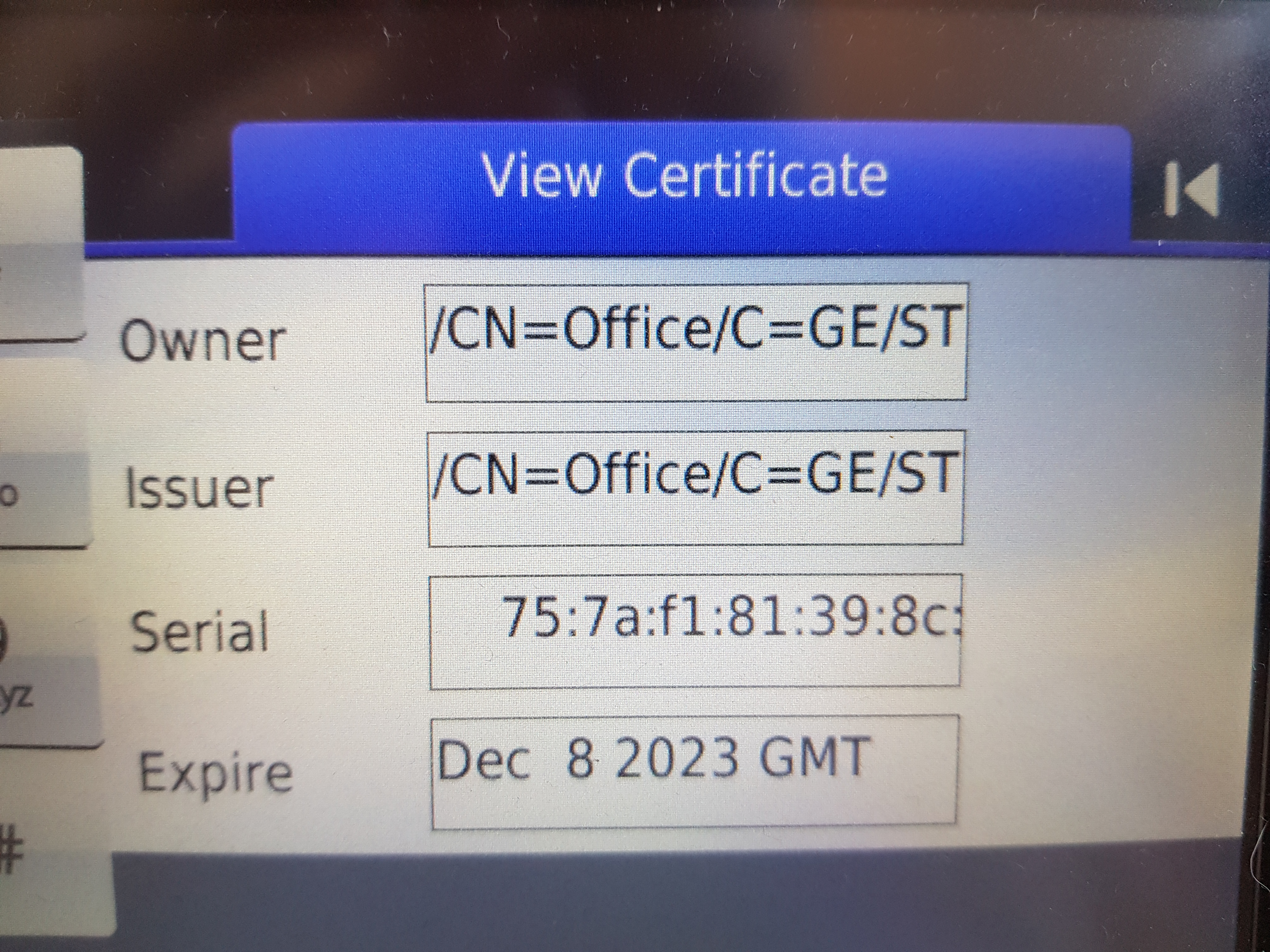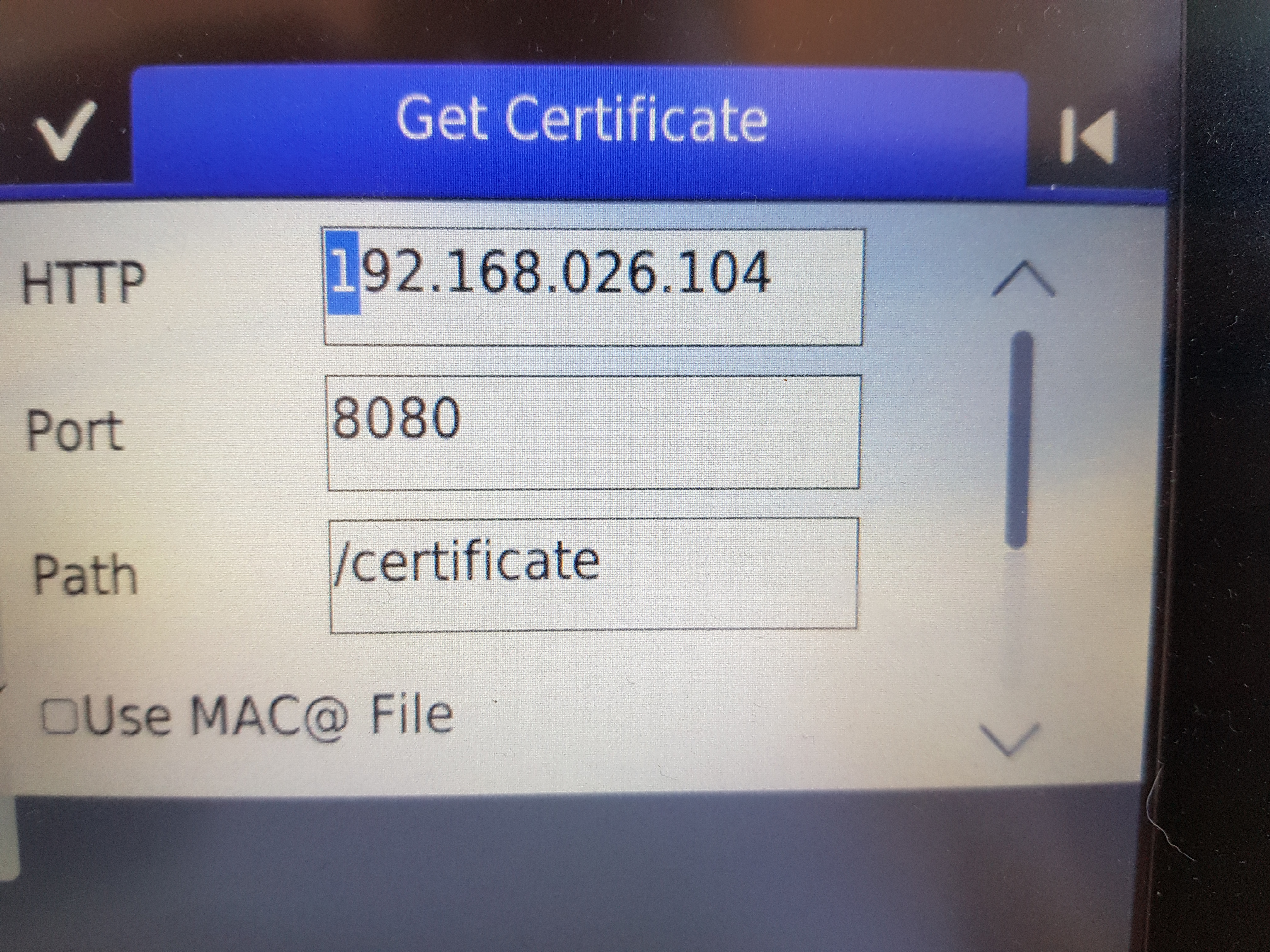 Damit das IP-Telefon das Zertifikat von einem Webserver herunterzuladen kann, müssen am Telefon manuelle Änderungen durchgeführt werden. Zuerst starten wir das Telefon. Wenn im Display des Telefons Punkt 2/5 „network setup“ steht, kann mithilfe von „i + #“ in das Konfigurationsmenü des Telefons gesprungen werden. Um den Webserver und das Verzeichnis des Webservers anzugeben, muss in das Menü „Certificate → Get Certificate“ die IP-Adresse, der Port, das Verzeichnis und das Zertifikat angegeben werden.