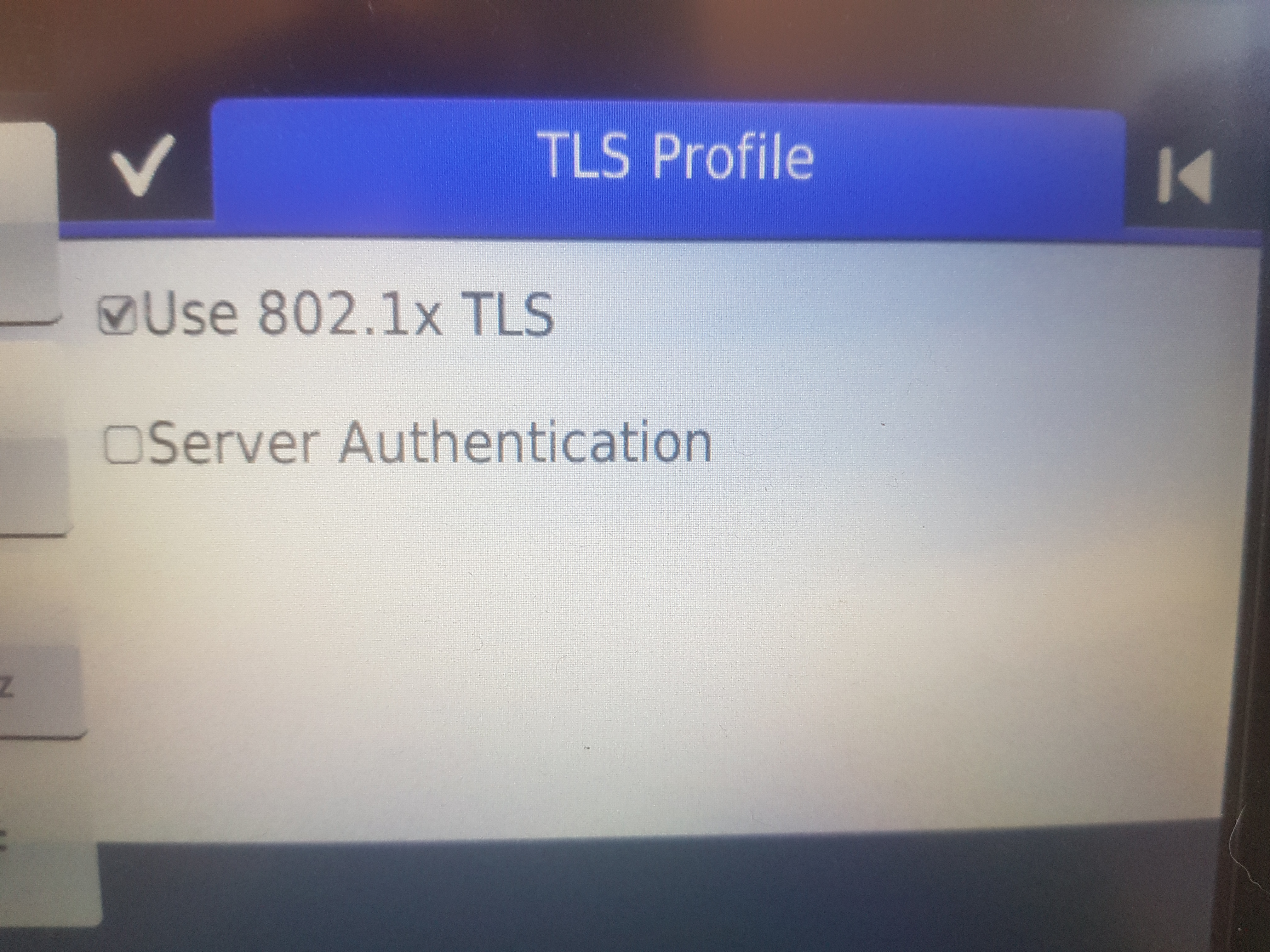 Im Grundmenü (Punkt 2/5 „network setup“ | i+#) findet man den Punkt „802.1x. Darunter befinden sich die Einstellungen, in welcher Form sich das Telefon mit 802.1x authentifizieren soll. In unserem Fall gehen wir auf „TLS Profile“ und aktivieren „Use 802.1x TLS“.