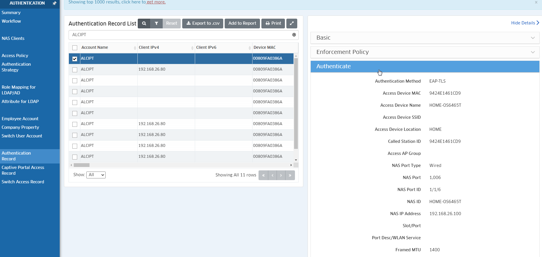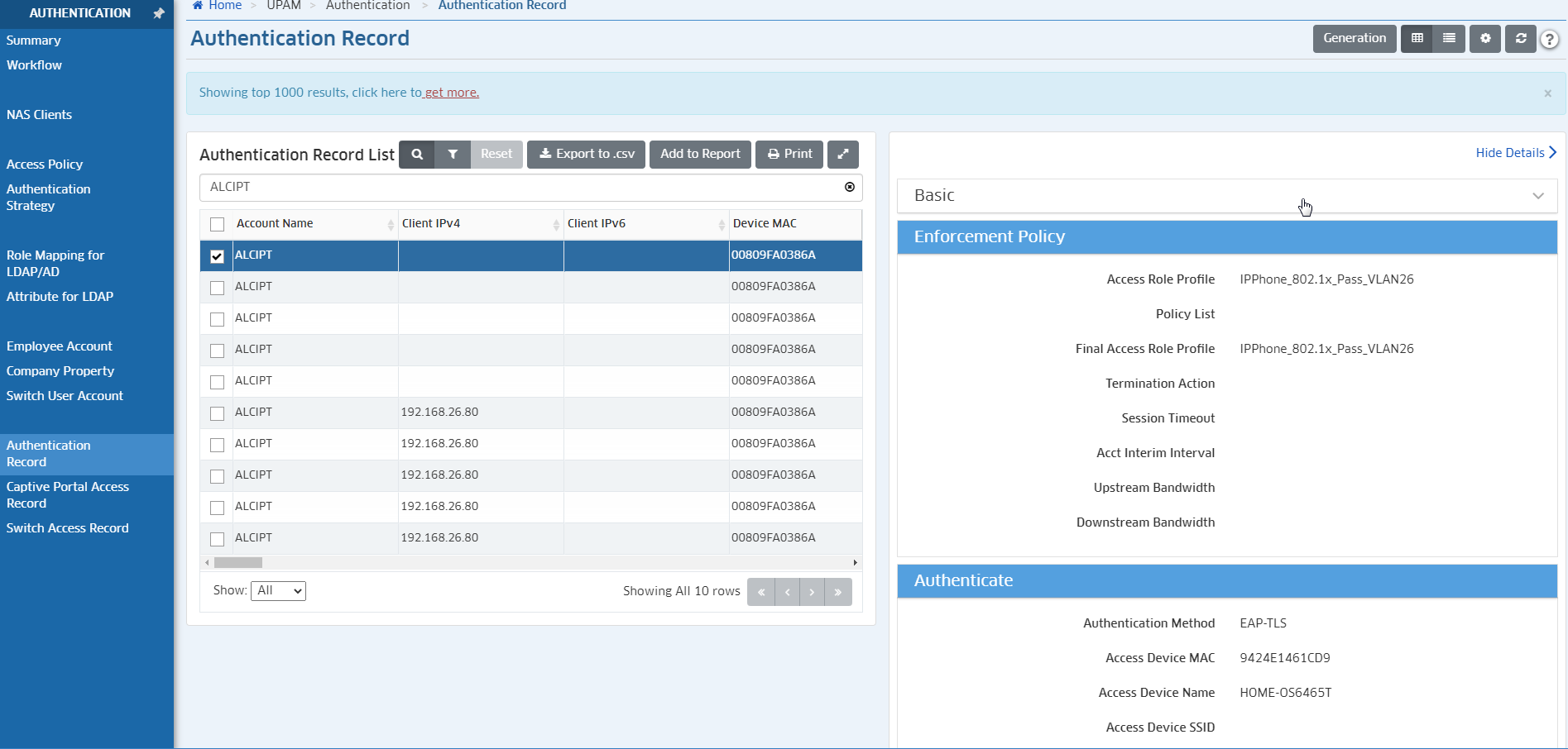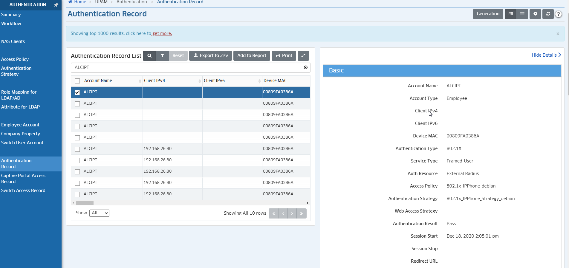 Da wir den OV2500 als Radius-Proxy nutzen, können wir dort überprüfen, ob das IP-Telefon richtig authentifiziert ist. Den Authentication Record befindet sich unter dem Punkt „UPAM → Authentication“. Im Suchfeld kann man nach dem Account Name „ALCIPT“ suchen.