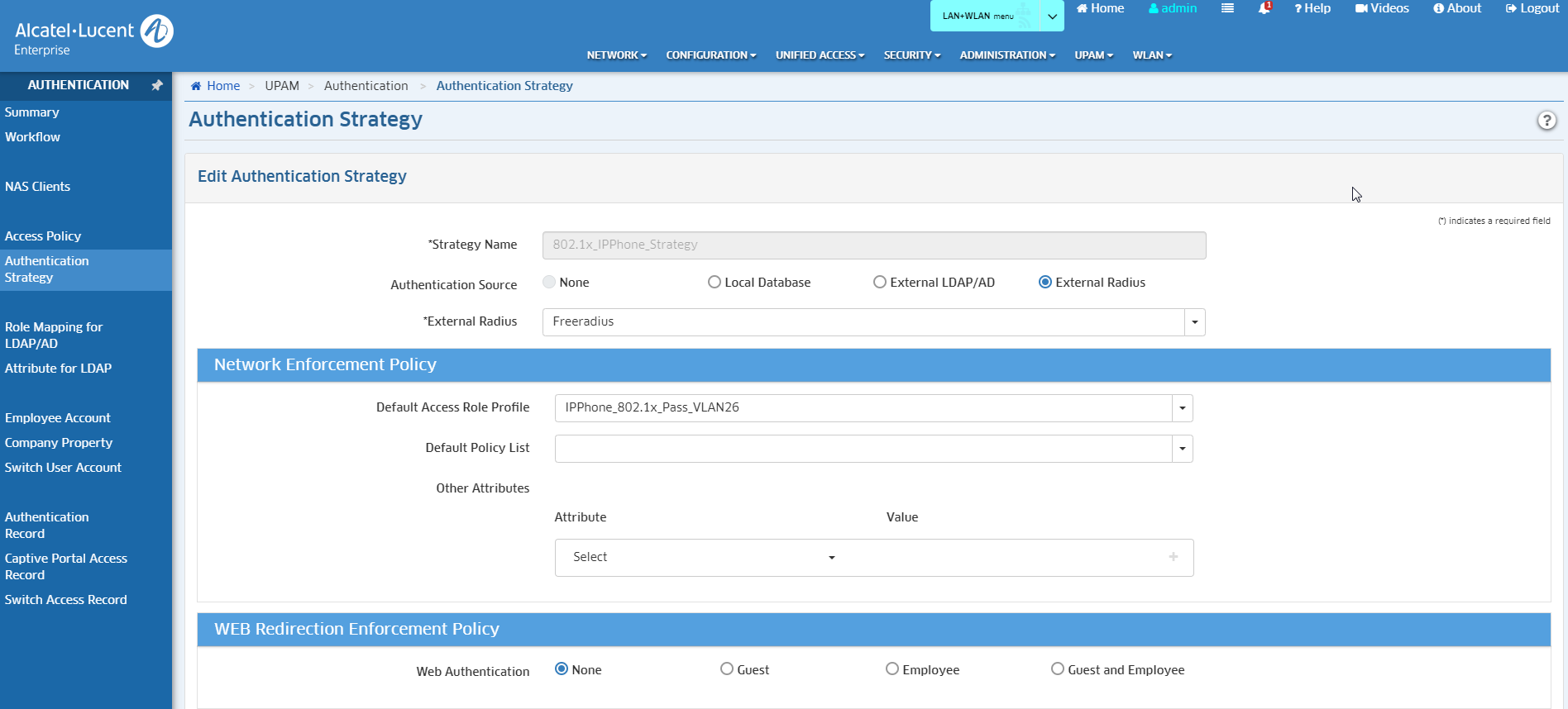 In der Authentication Strategy habe ich die Möglichkeit anzugeben, über welchen Authentication Server der Client authentifiziert werden soll und was bei einer erfolgreichen Authentifizierung passieren soll. Wir nehmen für unsere Authentifizierung der IP-Telefon unseren freeradius als „External Radius“ und wählen als Default Access Role Profile „IPPhone_802.1x_Pass_VLAN26“ aus.