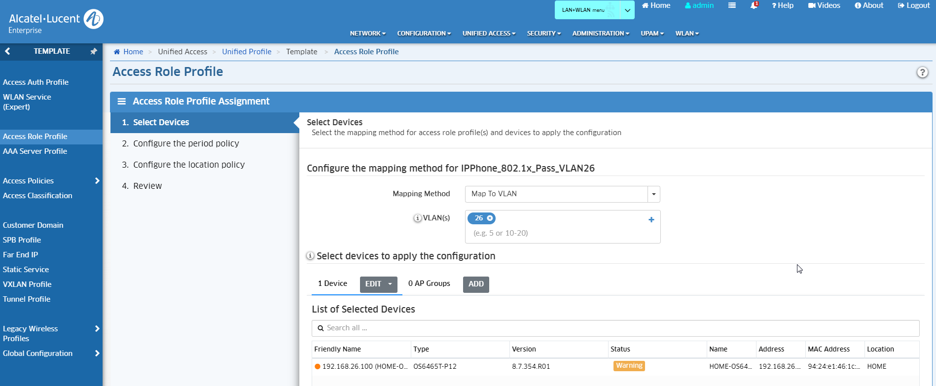 Dieses „Access Auth Profile“ kann nun durch „Apply to Devices“ auf ein Switch und den dazugehörigen Ports ausgerollt werden. In diesem Fall haben wir den Swtich 192.168.26.100 und den Port 1/1/6.