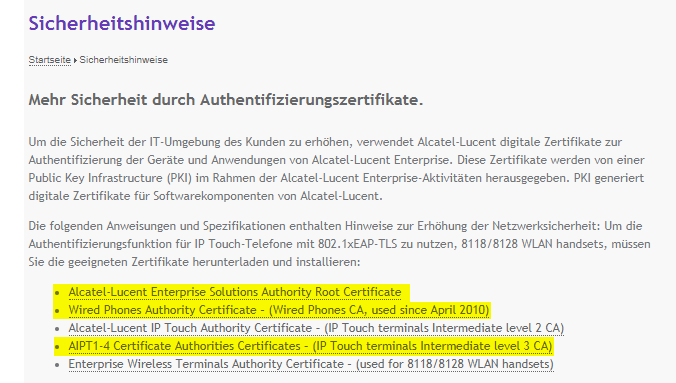Die öffentliche Alcatel-Zertifikate für die IP-Telefone können im Business Partner Portal heruntergeladen werden! Öffentliche Alcatel-Zertifikate Business Partner Portal