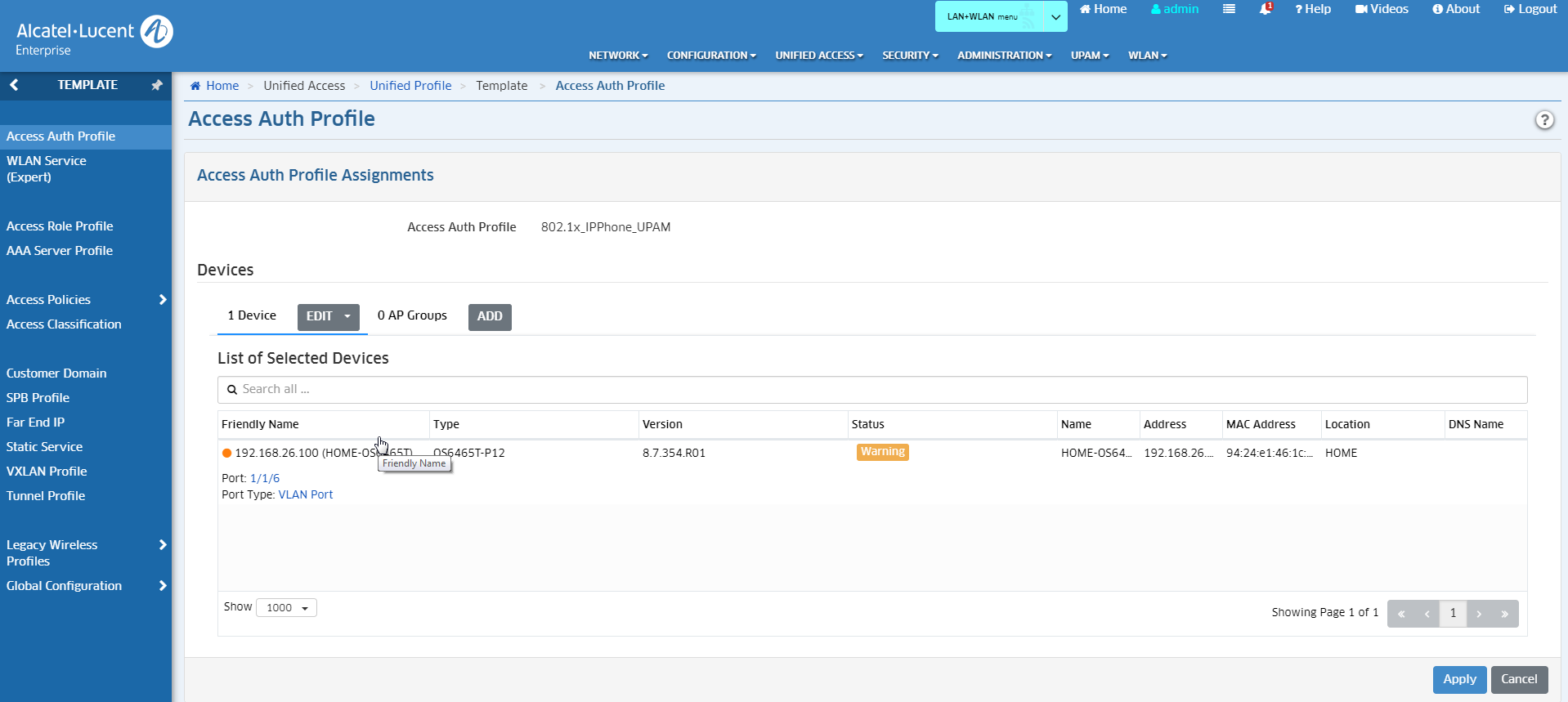 Dieses „Access Auth Profile“ kann nun durch „Apply to Devices“ auf ein Switch und den dazugehörigen Ports ausgerollt werden. In diesem Fall haben wir den Swtich 192.168.26.100 und den Port 1/1/6.