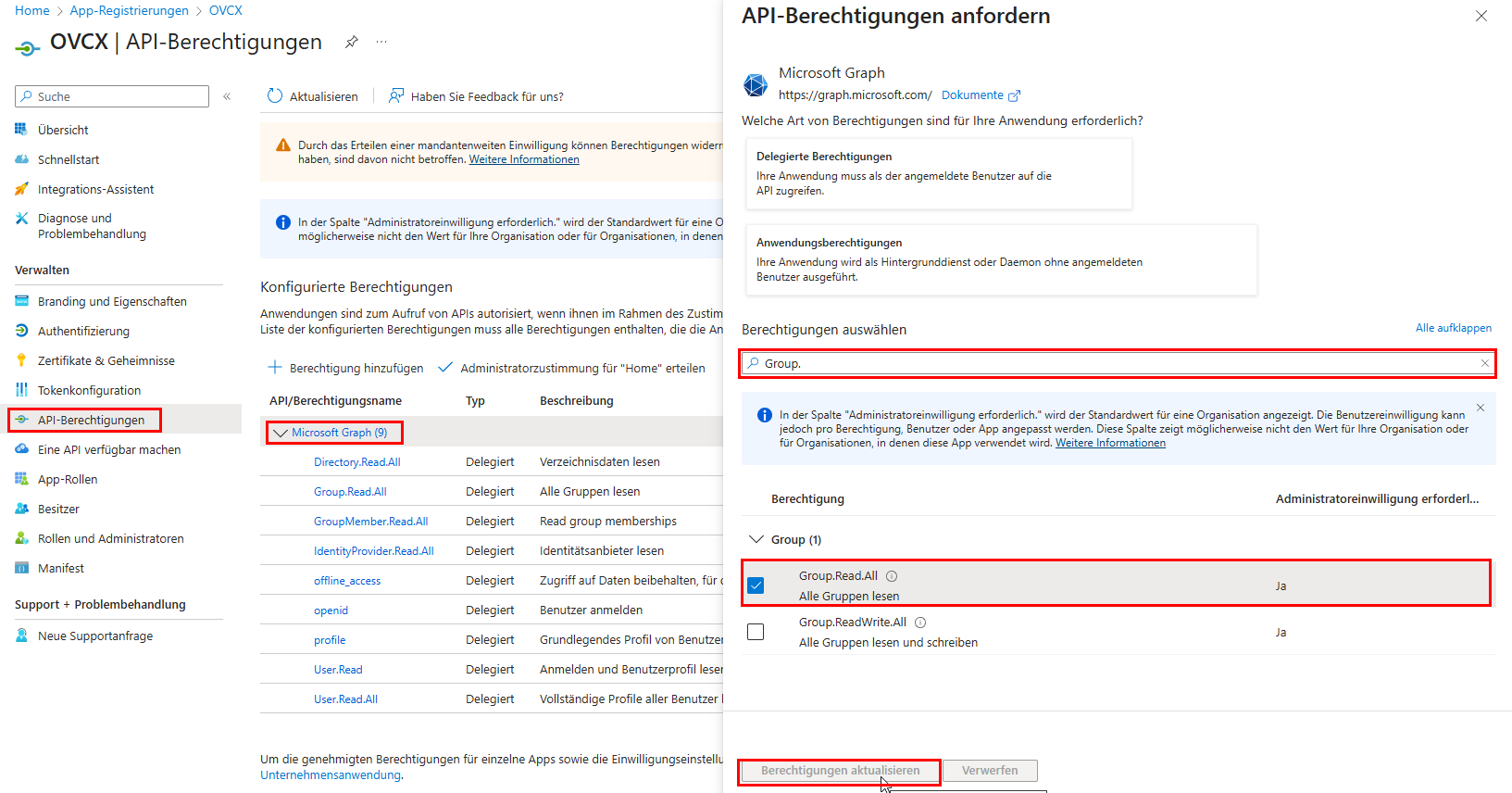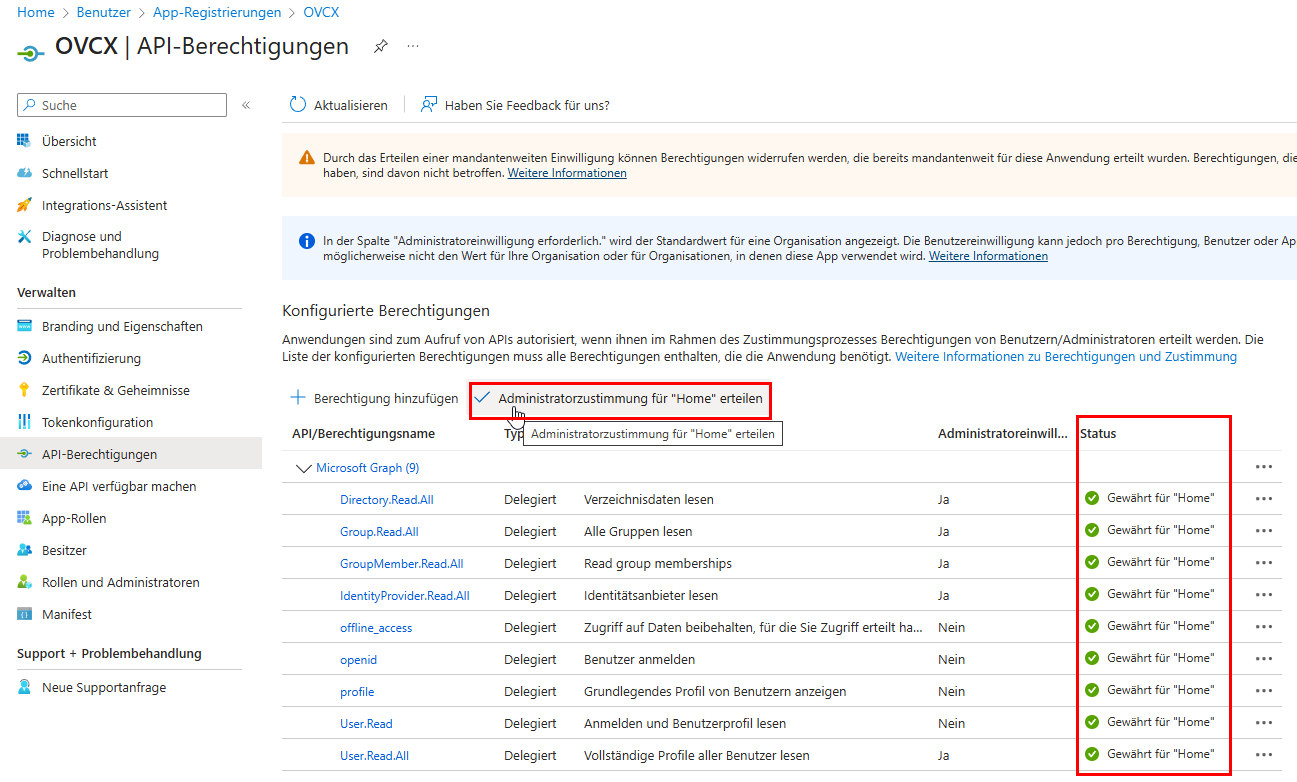 Wichtig!!! Wenn alle Berechtigungen hinzugefügt wurden, muss noch die „Administratorzustimmung für „XXXX“ erteilt“ werden!