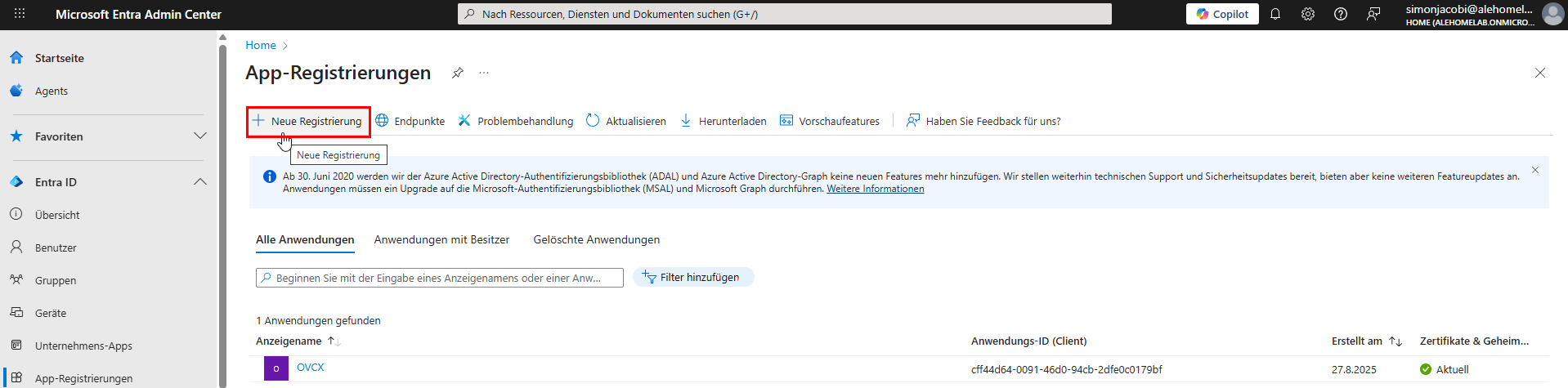 Zuerst muss über den Microsoft Entra Admin Center unter App-Registrierung eine neue Anwendung angelegt werden.
