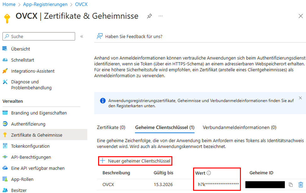 - Client Secret = Wert (Geheimer Clientschlüssel)