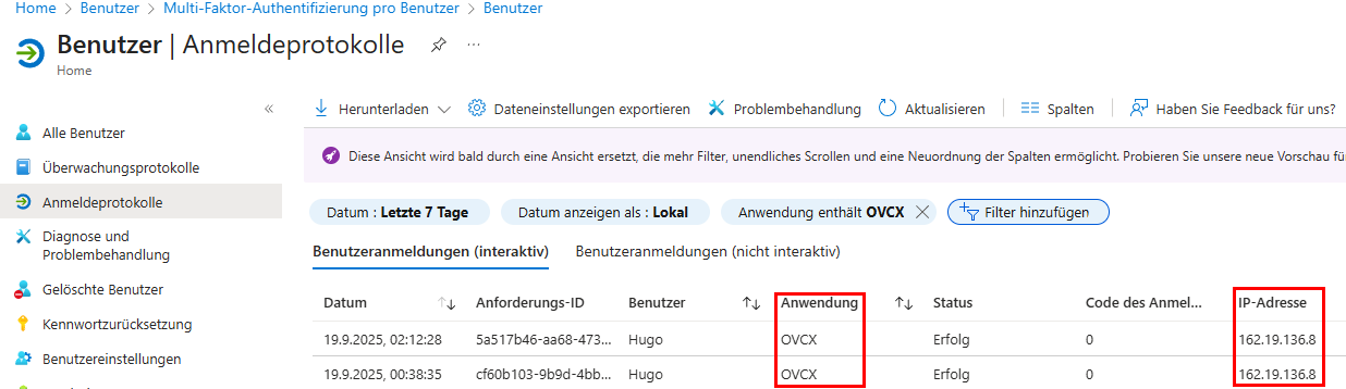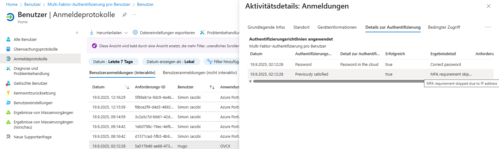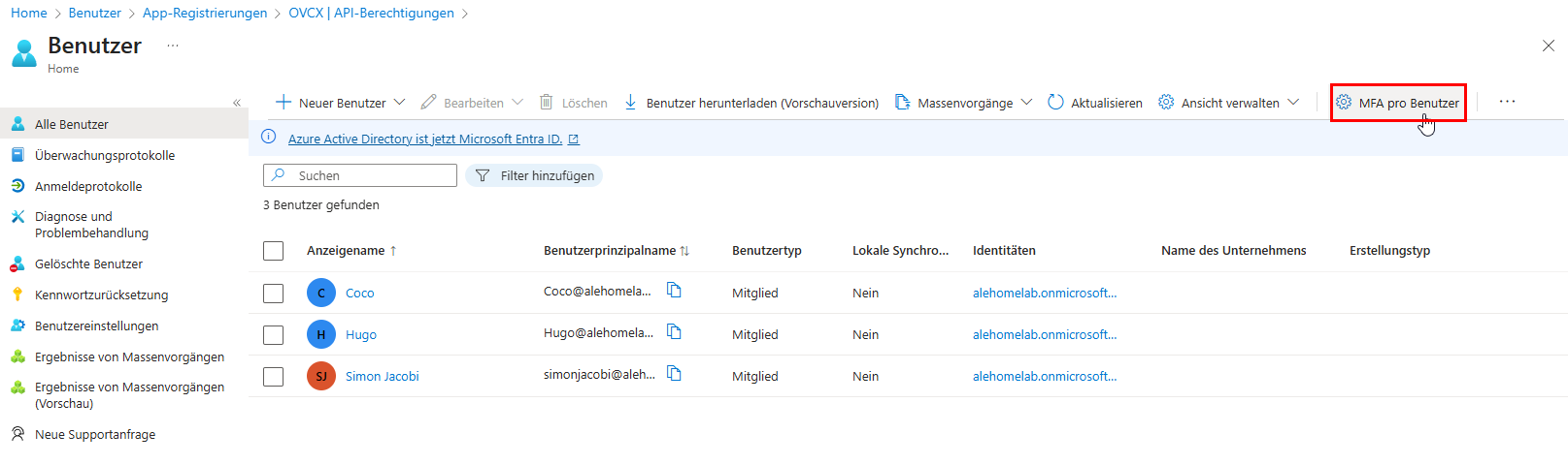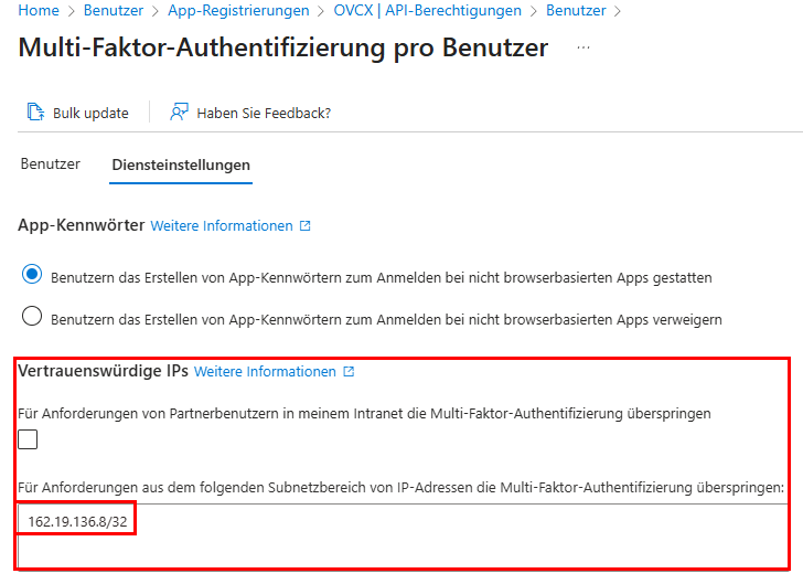 Sollte der MFA Login aktiv sein, muss man bei den Benutzern ein Regelwerk anlegen. Bei den Benutzer gibt es die Einstellung „MFA pro Benutzer“. Unter diesem Punkt gibt es einen Reiter „Diensteinstellungen“. Dort kann man „Vertrauenswürdige IPs“ hinterlegen. Da die angelegte Anwendung unter App-Registrierung immer mit der selben IP-Adresse im Entra ID anfragt, kann man diese IP-Adresse als Vertrauenswürdig einstufen und die MFA wird „nur“ für diese Anwendung ausgesetzt.