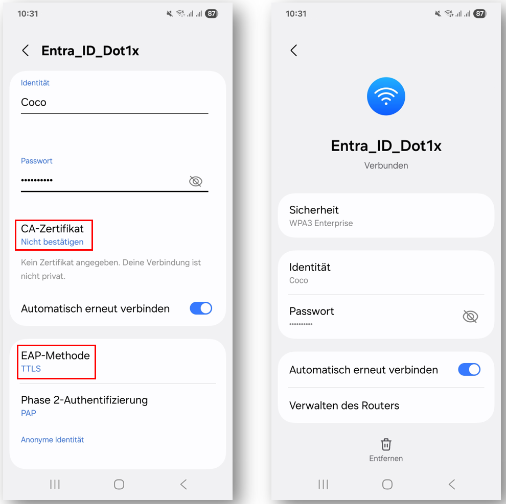 Um sich erfolgreich mit der SSID zu verbinden, benötigt man KEIN Zertifikat. Als Authentifizierungsmethode wählt man „TTLS“ aus. Anschließend kann man sich mit Benutzer/Passwort, welches im Entra ID hinterlegt ist, einloggen.