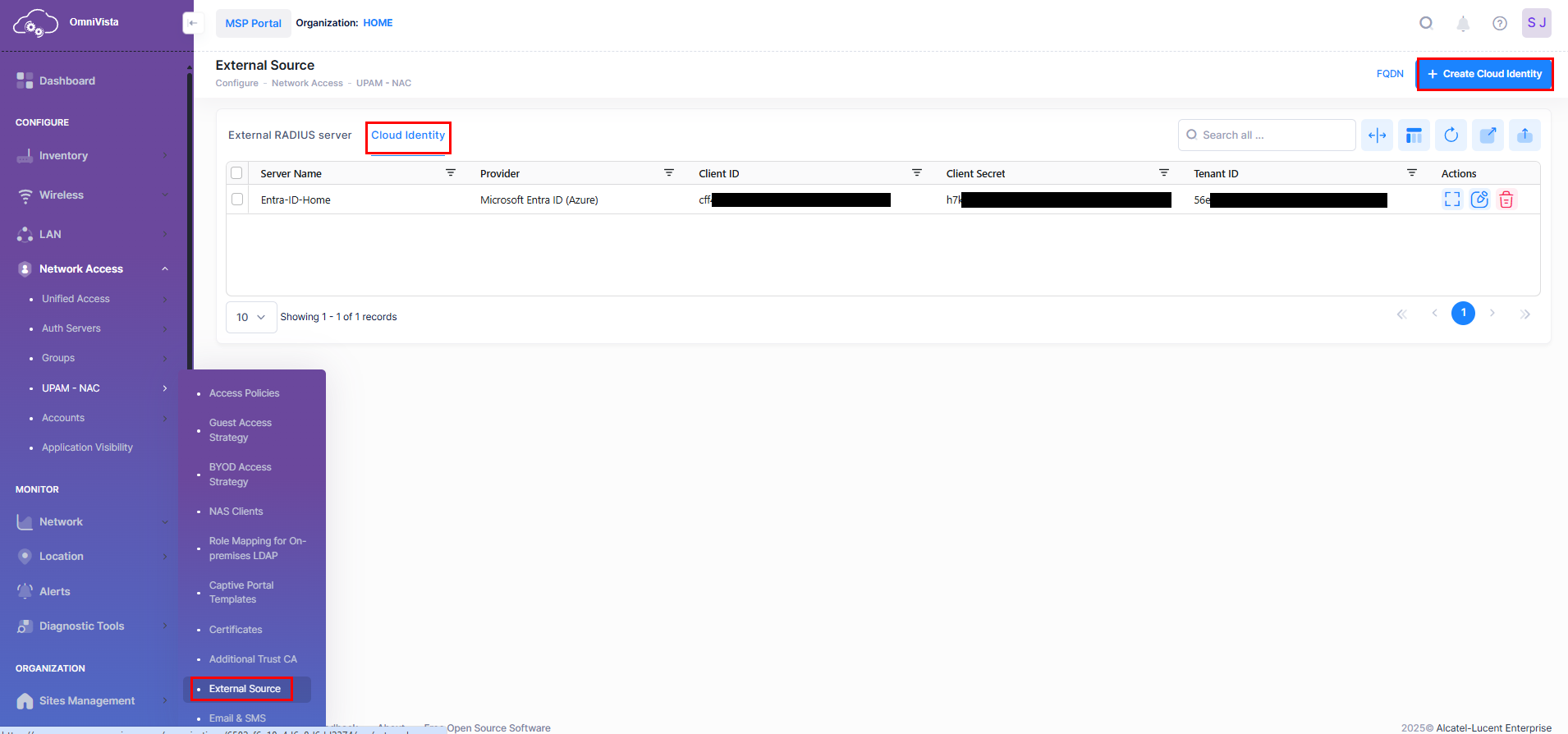 Die Anbindung von Entra ID befindet sich unter „Network Access → UPAM-NAC → External Source“. Dort kann man in dem Reiter „Cloud Identity“ das „Microsoft Entra ID (Azure) anbinden.