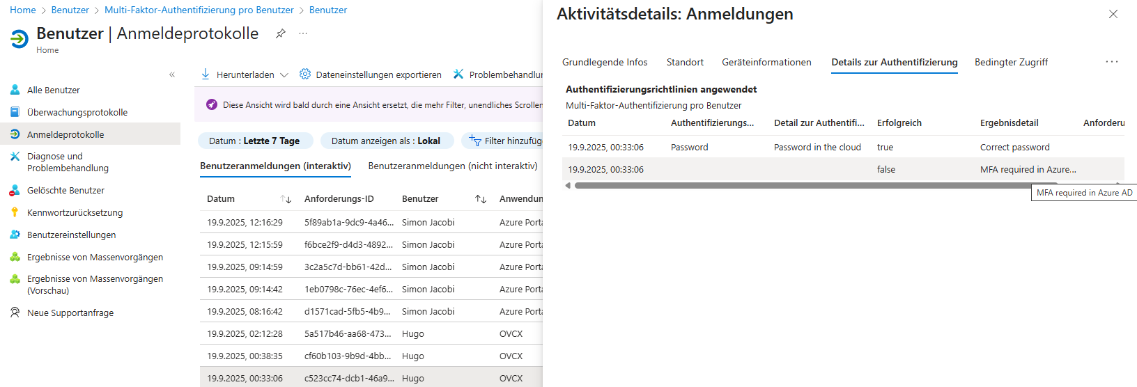 Sollte der MFA Login aktiv sein, muss man bei den Benutzern ein Regelwerk anlegen. Bei den Benutzer gibt es die Einstellung „MFA pro Benutzer“. Unter diesem Punkt gibt es einen Reiter „Diensteinstellungen“. Dort kann man „Vertrauenswürdige IPs“ hinterlegen. Da die angelegte Anwendung unter App-Registrierung immer mit der selben IP-Adresse im Entra ID anfragt, kann man diese IP-Adresse als Vertrauenswürdig einstufen und die MFA wird „nur“ für diese Anwendung ausgesetzt.