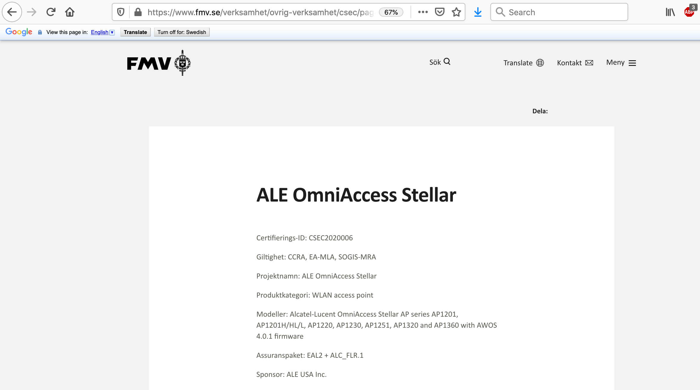 - Details zum Vorgang/Status: fmv.se (Zertifizierungsstelle) - Details für ALE OmniAccess Stellar WLAN